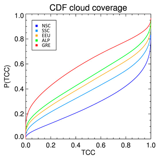 Cumulative density function (CDF) of cloud cover for the five regions. P (TCC) is the probability to occur that a certain total cloud cover (TCC) rate is exceeded. (Data: ECMWF ERA-INTERIM [30] 2000–2012).