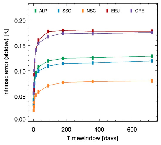 The change in uncertainty appears to plateau when the time window size increases beyond approximately one year (Figure 5). A 721-day time window is associated with almost the same amount of intrinsic error (0.136 K) as a 180-day time window size (0.134 K).
