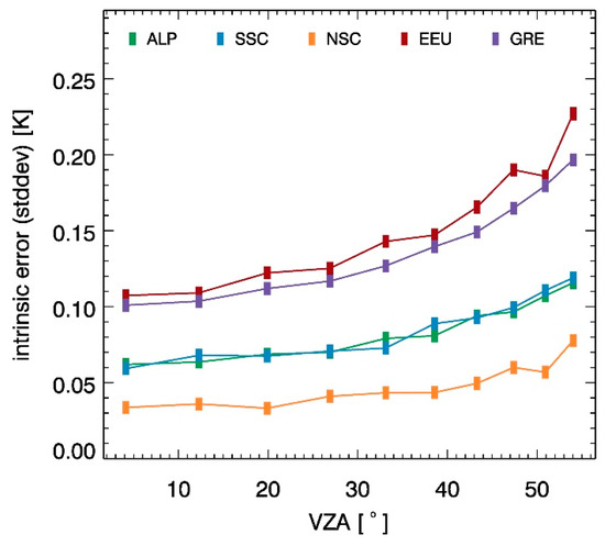 We expected a rather stable behavior to be associated with changing the VZA parameter, since it is integrated in the retrieval method (Equation (1)). In particular, the method was designed to handle the whole range of possible VZA values with the same set of coefficients. However, upon further inspection of the individual intrinsic errors associated with each resultant subrange after splitting the full range of VZA values into 10 bins (Figure 6), it is evident that for VZA of more than 35 to 45 degrees, the intrinsic error increases significantly over all of the investigated regions.