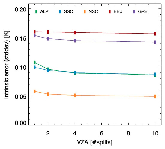 Figure 7 highlights only a slight increase in the overall accuracy with respect to how the VZA range is divided into several small sub-ranges with own coefficients. Strong sensitivity to changes in the VZA is detected in the ALP site with an SI of 0.2 and the uncertainty is reduced from 0.108 K to 0.086 K (Table 4). In the NSC (SI 0.15), SSC (SI 0.12), and GRE (SI 0.07) sites, the reduction in uncertainty is already very low, whereas there is no significant improvement observed over the EEU (SI 0.02) site.