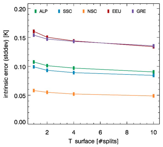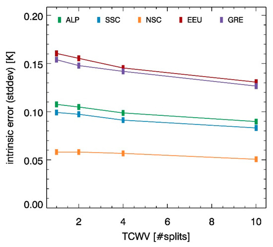 Similar to the results of the investigation with TCWV, we observe that dividing the Tsfc range into subranges has a similar effect for all regions (Figure 9). In terms of absolute change in intrinsic error, the strongest reduction is observed in the EEU site, ranging from 0.160 K to 0.134 K, while the lowest reduction is observed in the NSC site, ranging from 0.058 K to 0.049 K. In terms of SI, all the regions have a similar sensitivity to Tsfc (EEU SI 0.17 to SSC SI 0.15), excepting the GRE site (SI 0.12), which is associated with a considerably lower sensitivity (Table 6). The observation over the latter may be related to the elevated TCWV rates around the warm Mediterranean Sea, which corresponds to the high general uncertainty related to the potential effects of Tsfc bins. However, the exact cause for this remains unknown.