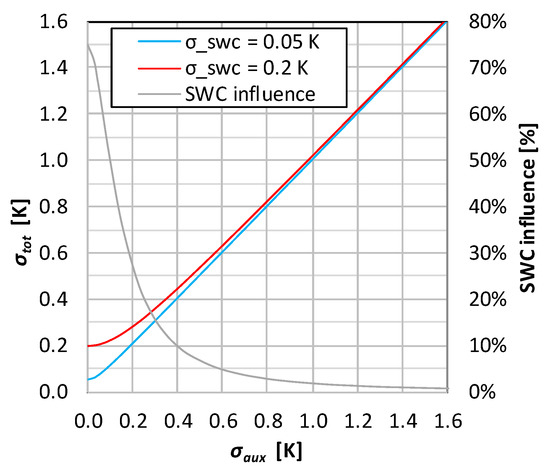 Based on this observation, the influence of SWC can be considered to be negligible for total uncertainties above 0.8 K (<3%). It becomes significant at an uncertainty of around 0.6 K (>5%). The increasing uncertainty steepens with respect to the introduction of important influences at 0.45 K (9.7%) or even at 0.3 K (23.6%).