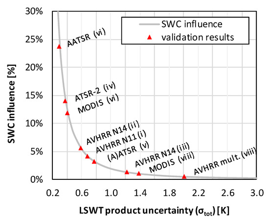 The gray line represents the estimated influence of SWCs on the accuracy of LSWT products (same as in Figure 11, but plotted against the total uncertainty). The red triangles represent the estimated influence of SWCs for different validated LSWT products in literature. (i [11]; ii [29]; iii [37]; iv [12]; v [38]; vi [13]; vii [18]; viii [20]).