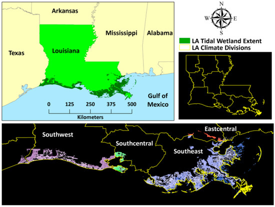LA has the largest salt marsh ecosystem (>6500 km2) in the United States (US) [] (Figure 1). The ecosystem is mostly dominated by smooth cordgrass (Spartina alterniflora), and salt meadow cordgrass (Spartina patens). Apart from that, patchy distributions of American Glasswort (Salicornia virginica), saltwort (Batis maritima), and seashore saltgrass (Distichlis spicata) are also encountered. The distribution of black needle rush (Juncus roemarianus) is limited along the brackish regions. The high salinity and anoxic soil do not allow the growth or survival of non-specialized plant species; hence, floral diversity is remarkably low []. The climate of the region is tropical to sub-tropical; it is characterized by hot and humid summers, with occasional tropical storms and moderately cold winters. The salt marshes stretch across four state climatic divisions: southwest, south-central, southeast, and east-central []. The majority of the salt marsh ecosystem falls within the southeast (~4000 km2) and the southwest (~2000 km2) climatic zones. The average annual temperature in this region varies between 15–25°C, while annual precipitation ranges from 80 cm to 100 cm []. Since 2000, the salt marsh ecosystem in LA has experienced the landfall of major hurricanes, such as Lili in 2002 (Category 1), Katrina and Rita in 2005 (Category 4 and 3, respectively), Gustav in 2008 (Category 2), and Isaac in 2012 (Category 1) []. The marsh ecosystem in LA is also home to more than 160,000 oil and gas wells [] that account for almost 18% of the oil and 24% of the natural gas production in the US, and are valued at $6.3 billion and $10.3 billion, respectively []. Hence, these ecosystems have been subjected to intense dredging and channelization for transportation as well as significant groundwater removal, which has led to soil and marsh erosion and localized subsidence. Further, the sediment flow from the Mississippi River, which typically provides nutrients and substrate for salt marshes, has been extensively trapped and diverted through the excessive construction of levees across the LA coast. Therefore, it is increasingly difficult for the salt marshes to sustain themselves and fight against sea level rise. Disturbed salt marsh ecosystems in the region have been invaded by common reed (Phragmites australis) at certain places [].