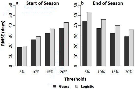 Root mean square error (RMSE) estimates for the (a) start of season and (b) end of season dates between the derivative analysis and TIMESAT thresholds for both asymmetric Gaussian and double logistic smoothing functions.