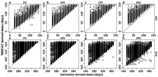 Residual plots matching the Julian dates derived from the derivative analysis (x-axis) and TIMESAT thresholds (y-axis) for (a–d) start of season (SOS) and (e–h) end of season (EOS), from ~400 randomly selected pixels, across LA salt marshes. TIMESAT thresholds (5%, 10%, 15%, 20%) have been specified for individual residual plots.
