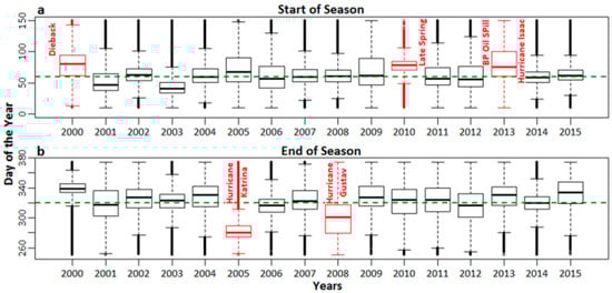 (a) SOS and (b) EOS dates for the salt marshes of southeast LA. The dotted line represents median SOS and EOS dates. Late SOS and early EOS dates are highlighted in red along with environmental events (such as dieback, late spring onset, BP Oil Spill, Hurricane Isaac for the SOS, and Hurricanes Katrina and Gustav for the EOS) possibly influencing such events.