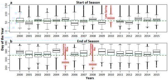 (a) SOS and (b) EOS dates for the salt marshes of southwest LA. The dotted green line represents median SOS and EOS dates. Late SOS and early EOS dates are highlighted in red along with environmental events (such as late spring onset for the SOS, and Hurricanes Rita, and Ike for EOS) possibly influencing such events.