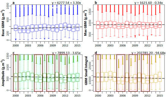 Simple linear trends in GBM base values, GBM max values, seasonal GBM amplitude, and small GBM integral are shown in Figure 6. Overall, during the 16-year study period, the GBM base values showed positive trends (Figure 6a) and GBM max values remained stable, while the rest of the seasonality parameters showed negative trends (Figure 6b–d). We also observed a periodic decline in the levels of GBM amplitude and GBM small integral in the years 2000, 2005–2006, 2008, and 2011–2012. However, we noticed subsequent improvements in the levels of these seasonality parameters after the short-term decline as well, when environmental conditions improved.