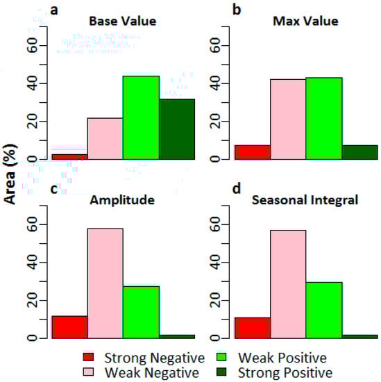 Percentage of area coverage with different trends for (a) GBM base value; (b) GBM max value; (c) GBM amplitude; and (d) GBM small seasonal integral for the salt marshes in Louisiana.