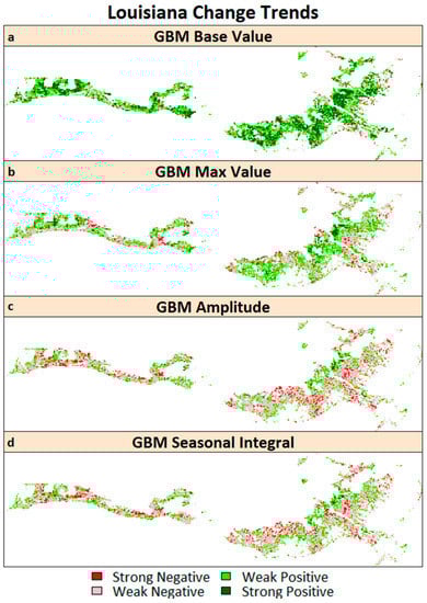 Spatial distribution of the areas showing different trends for (a) GBM base value; (b) GBM max value; (c) GBM amplitude; and (d) GBM small seasonal integral for salt marshes in Louisiana.