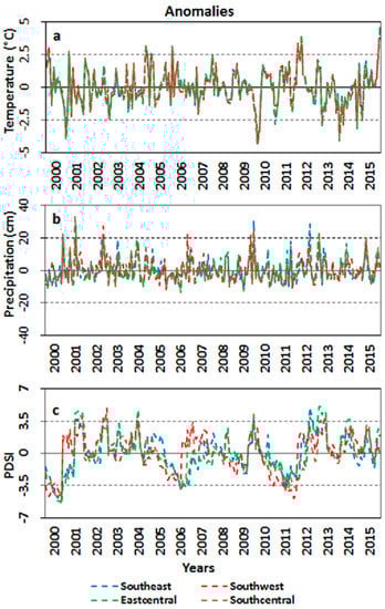 (a) Temperature; (b) Precipitation; and (c) Palmer Drought Severity Index (PDSI) anomalies for all four coastal climatic zones of LA.