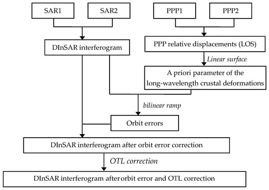 Flow chart for analyzing the orbit errors and ocean tide loading (OTL) effect in differential interferometric synthetic aperture radar (DInSAR) measurements.