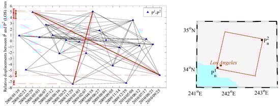 DInSAR technology is concerned with temporal comparisons of the displacements at the pixel basis by repeat passes of the satellite. Meanwhile, we are also concerned with spatial comparisons across the footprint of each SAR image. We made a preliminary analysis of the spatial comparisons of two extreme points using the OTL displacements calculated by the SPOTL program. We selected (close to the coastline) and (far from the coastline) in the range of the th SAR image and calculated their relative displacements in the LOS direction () using the OTL displacements (Figure 2).