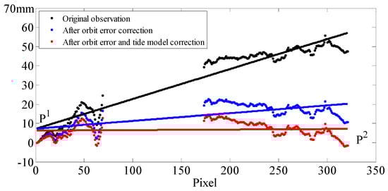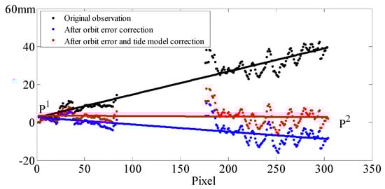 The pixel values from point to were fitted to lines, the variations in the line slopes in Figure 8 and Figure 9 can reflect the actual effect of the orbit errors and the OTL effect in DInSAR interferograms D0912 and D0322. The effectiveness of the FES2004 tide model in correcting the OTL effect is shown in Table 2.
