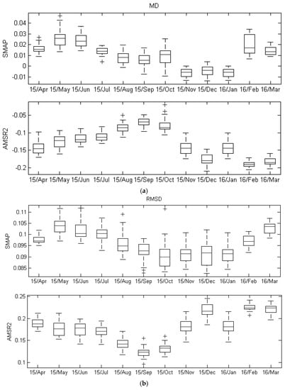 The accuracy of AMSR2 L3, SMAP L4 soil moisture data are evaluated in terms of the MD, the RMSD, and the R. The MD represents the bias, namely the systematic difference between satellite soil moisture retrievals and in situ soil moisture measurements. The MD can be calculated using the following formula: