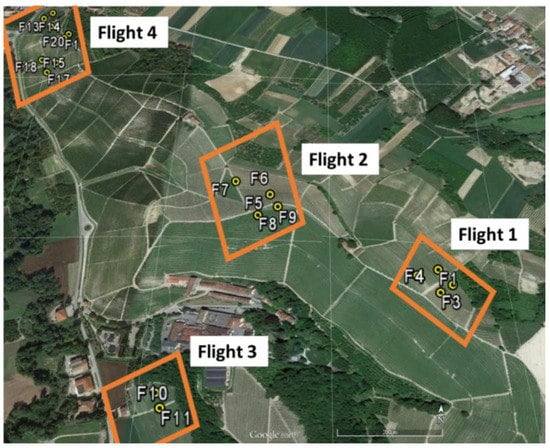 There were 20 sampled sites called elementary sampling units (ESU) (Figure 1). They cover a square area of 10 m side and were selected to represent the range of possible growing patterns, row orientation and slopes as well as variable amount of grass between the rows. The coordinates of each ESU were measured with a GPS within a few meters accuracy. The 20 ESUs were grouped into four zones corresponding to four UAV flights (Figure 1). The variation in height in each area covered by the flights is 2 m (flight 3), 14 m (flight 1), 20 m (flight 2) and 35 m (flight 4).