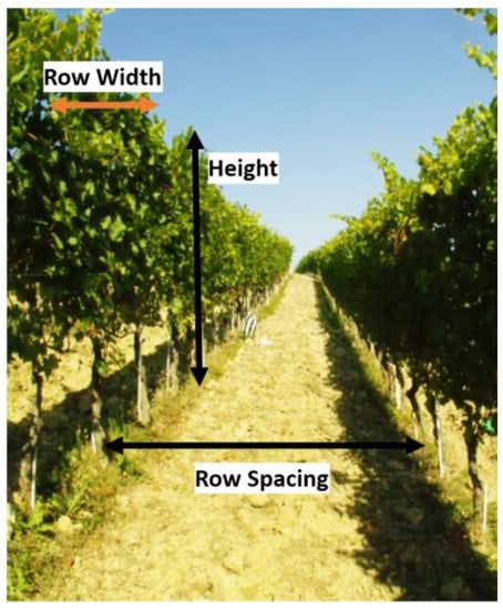Although potentially promising, remote sensing from satellite observations is not often routinely used except by [], who characterize crop coefficients for irrigation management. Indeed, satellite observations raise a number of problems specific to vineyards, mainly associated with the heterogeneous structure of the canopy in relation to the spatial resolution of the satellite images. First, the spatial resolution of the existing sensors providing images at a reasonable cost, such as LANDSAT, SPOT or Sentinel-2 (from 5 to 30 m), is not adapted to very small vineyard fields []. The main limitation in this case is due to the mixed nature of the signal measured in a single pixel [] since vineyards are cultivated in rows with the row spacing potentially occupied by green grass, making the extraction of the specific signature of the rows complex. Further, the row structure [,,], as well as the terrain slope [,], induce directional effects on the reflectance signal that must be accounted for. The use of higher spatial resolution systems (a few centimeters to a few decimeters) thus appears mandatory to identify rows and extract the corresponding characteristics while minimizing the effects of the inter-row status (bare soil, senescent or green grass) and row orientation. Further, the row structure is of prime importance for the processing and interpretation of other sources of remote sensing data such as (i) thermal infrared images to identify shadowed elements when evaluating evapotranspiration for water stress monitoring [] or (ii) visible/near infrared images to accurately compute the fraction of intercepted radiation [].
