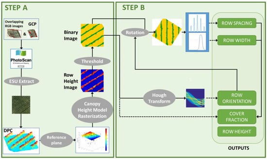 Figure 3 presents an overview of the algorithm that computes the characteristics of the 3D macro-structure of the rows. The pre-processing step consists in deriving a binary image from the overlapping RGB images acquired with the UAV (Figure 3, Step A). This is achieved by generating the dense point cloud (DPC) with the Agisoft PhotoScan software (Version 1.1.0) and then gridding the whole image into 10 m × 10 m square cells. Then, for each cell, we separate the soil pixels from the ones corresponding to the vegetation by fitting a soil reference plane using the 10% lowest points. This allows deriving the Canopy Height Model (CHM), e.g., the altitude of the points relating to the soil within the cell. The DPC is then rasterized with a 5 cm resolution and transformed into a binary image where background and vineyard are separated. Step B consists of characterizing the macro-structure of the vineyard rows (Figure 3, Step B). First, row height is derived from the height image. The orientation of the rows is computed by applying a Hough transform of the binary image, which is then rotated accordingly to get vertically oriented rows in the image. The cumulated profile of horizontally oriented vegetation pixels is finally computed to estimate row width and row spacing. Different methods are also used to estimate the vineyard cover fraction.