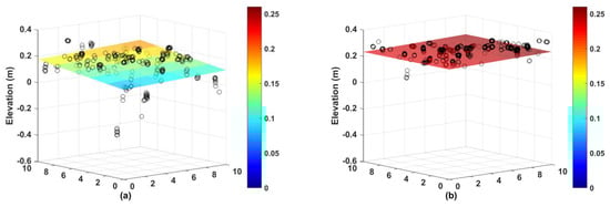Fitting the reference plane for the grid cell for ESU number 2 (a) and 19 (b). The circles correspond to the 10% lowest altitude points of the point cloud. The fitted reference plane is represented by the colored plane. The color indicates the local height of each sub-grid cell.