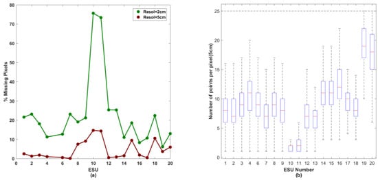 (a) Percentage of empty pixels in each ESU as a function of the pixel size: 2 cm (green) or 5 cm (red). (b) Distribution of the number of DPC points per pixel for the 20 ESUs and the 5 cm pixel size. The median is represented by the red horizontal bar. The box represents the 25%–75% percentiles. The whiskers include 99.3% of the data.
