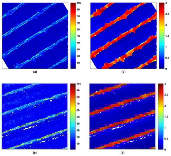 One of the main issues in vineyard characterization is to isolate the pixels belonging to the rows from the ones belonging to the row spacing. The difference in spectral properties between rows and inter-rows were first exploited by applying a threshold on vegetation indices computed on multispectral images [,,]. Other studies, based both on the spatial and the spectral properties of the rows, applied a Fourier transform to the red band of RGB images [,,]. However, these methods are obviously dependent on the spectral contrast between the row and inter-row composition with degraded performances in the presence of grass.