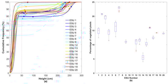 (a) Height cumulative frequency (%). Colored dots correspond to the measured minimum and maximum average height of the plants over each ESU. (b) Box and whisker diagram per ESU of the distribution of the percentage of vegetated pixels detected in the binary image when considering a height threshold varying between 50 cm and 170 cm. The bottom and the top of the box represent the first and third quartile while the red dash is the second quartile (median). A total of 99.3% of the data is included between the whiskers.