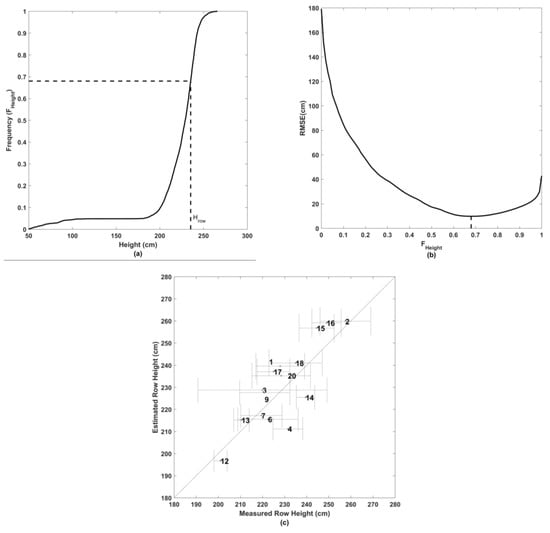 (a) Empirical cumulated distribution function of pixel height computed from the gridded height image for ESU20. Dashed lines indicate the height value for (b) Root mean square error (RMSE) between row height ground measurements and height computed from the cumulative distribution function at . The minimum is indicated by the vertical line ( ). (c) Comparison between row height estimates from UAV and ground measurements for the different ESUs.