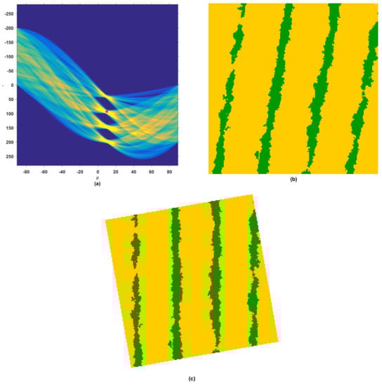 The row orientation is estimated by applying the Hough transform [] to the binary images similarly to the work of []. The Hough transform is a well-known algorithm that identifies linear features in an image: each pair of vine cells in the binary image forms a line. When represented in polar coordinates, the radius (ρ) is the distance between the two vine cells and the angle (θ) corresponds to the line orientation. Linear features correspond to high occurrence of [ρ, θ] values in the [ρ, θ] feature space (Figure 10a). The orientation from the north of the linear features (i.e., the rows in our case) is given by θ. Although the row orientation was not measured on the ground, the algorithm was validated by simply rotating the binary images by θ and assessing visually how vertical the rows were. Results confirm the efficiency of the algorithm to estimate the actual row orientation as illustrated in Figure 10b,c.