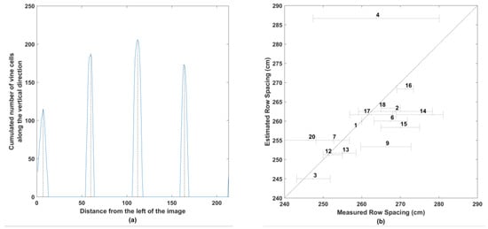 Once the row orientation is computed, the rotated binary image (Figure 10c) is used to compute the profile of the cumulated number of vine cells along the vertical direction, i.e., along the rows. Row center location corresponds to the peak summits of cumulated vine pixels (Figure 11a). To limit uncertainties due to relatively flat peaks, the summit location () is defined as the value for which the same cumulated number of pixels is observed from both sides. Further, to eliminate artefacts due to image borders, the first and last peaks are removed in case they are not fully included in the ESU. Finally, a constraint is put on the minimum distance between peaks to prevent from identifying rows that would be unrealistically spaced. A minimum distance of 35 pixels (175 cm) is used, considering that the row spacing in such vineyards is larger than 250 cm. This constraint must therefore be adapted when applied to other vineyards using different planting patterns. The row spacing is estimated as the average distance between row peaks.