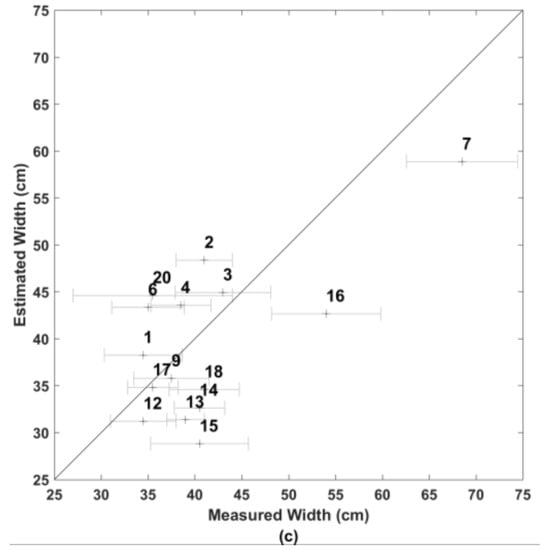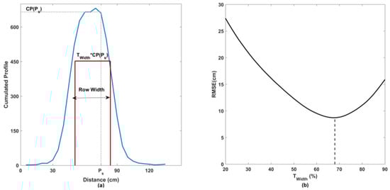 Once each row center is identified, the coordinates of the pixels across the row direction are shifted so that all the rows of the ESU overlap. The row cumulated profile is computed to identify the peak summit () and the corresponding value of the cumulated row profile. The row width is then defined as the distance between the two points of the cumulated profile corresponding to (Figure 12a) where is an optimized threshold value. Similar to what is proposed for the height determination, the value of , is adjusted to provide the best agreement with the ground measurements. The RMSE shows a relatively flat minimum between (Figure 12b). The optimal value is = 68% corresponding to a RMSE = 8.7 cm. This shows a relatively good agreement with the observed row width values, considering the image resolution (5 cm), and the ground measurement accuracy: the standard deviation of the measurements within an ESU varies between 2 cm for ESU#13 and 8.5 cm for ESU#20 (Figure 12c). The use of the cumulated profile makes the method robust and little sensitive to missing segments along the rows (unless the whole row is missing) and to the presence of grass in the inter-row.