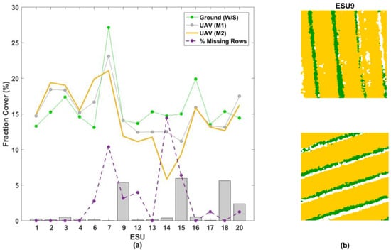 Results show that when the percentage of missing row segments and the percentage of missing pixels are small (ESUs 1 to 4, 13, 16, 17), a very good consistency between the two methods and the ground measurements is observed (Figure 13a). Further, for ESUs with a significant percentage of missing row segments and few invalid pixels (ESUs 6, 7, 12 and 14), the vegetation cover fraction is not accurately estimated when using the row width and row spacing, as in method M1 and ground measurements. Finally, when the percentage of invalid pixels is significant (ESUs 9, 15, 18, and 20), the consistency between the two methods for cover fraction estimation and the ability of detecting missing segments is weak: results mainly depend on whether the invalid pixels are mainly located within the row or not: for ESU#9, the cover fraction estimated with M2 is lower than that using M1 since invalid pixels are mainly located in the fourth row (Figure 13b top). Conversely, a good consistency is observed between the two methods for ESU#18 for which the invalid pixels are located consistently at the border of the rows (Figure 13b bottom). However, the good consistency does not mean that the estimated cover fraction is accurate since, in this case, the row width of ESU#18 was significantly underestimated (Figure 12).