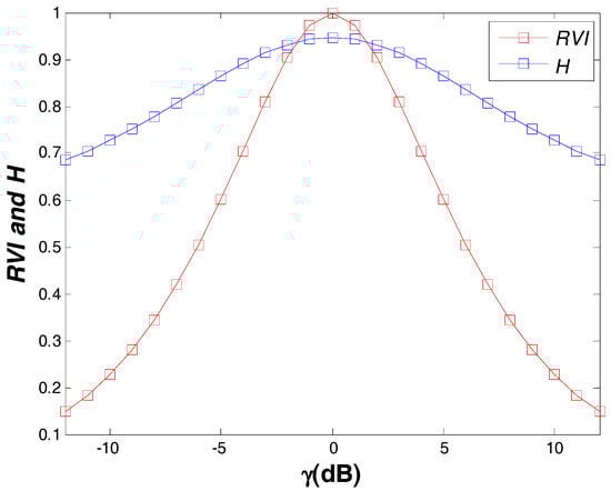 where represents the co-polarization power ratio of HH and VV components, i.e., , which can be estimated directly from the measured PolSAR data. As was analyzed in [21], the GVSM model showed good agreement with the three typical cases of volume scattering model in Yamaguchi-based decomposition corresponding to three specific co-polarization power ratios (i.e., 8/3, 1, 3/8). However, besides these three cases, the GVSM can cover the whole dynamic range of values for the ratio. In order to further present the generality of GVSM, as proposed by Huang et al. [26,27], we employ two common scattering randomness measurements to analyze its dependence on the ratio . One is the radar vegetation index () introduced by Kim and van Zyl [29], which is an indicator to measure scattering randomness. The definition of is given as