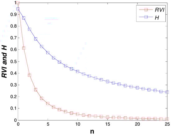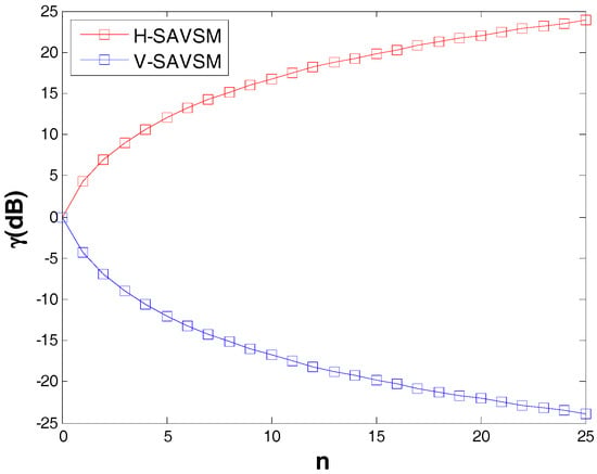 From the above expressions, it can be seen that the SAVSM includes two categories and depends on the power variable , which is a real value. Actually, it is not difficult to check that the three volume scattering models in Yamaguchi decomposition method are exactly three special cases in SAVSM. In addition, when , it satisfies . However, the SAVSM covers more types of volume scattering model aside from these three cases. Because the SAVSM includes two categories, the first step should be selecting one of them according to a certain criterion. As in the Yamaguchi decomposition method [18,19,20,21], the co-polarization power ratio (i.e., ) is used to determine the type of volume scattering model. The volume scattering model will choose the random dipoles volume scattering model when is within , whereas it will select horizontal dipoles model for and vertical dipoles model for . Figure 2 shows the dependence of co-polarization power ratios of H-SAVSM and V-SAVSM on the power variable n. From this figure, it is evident that a null ratio is a suitable threshold to distinguish the H-SAVSM and V-SAVSM, which is not the same criterion used by Huang et al. [27]. Afterwards, the next step should be determining the value of . Since is used to define the probability density function of the orientation of particles, its value will determine the degree of scattering randomness. As shown in [26,27], the dependence of the common scattering randomness measurements and on the value of is illustrated in Figure 3. It is obvious that the values of both parameters decrease monotonically when increases from zero to infinity. As in Huang et al. [27], based on the relationship between and , the optimum n can be determined when the difference between the of covariance/coherency matrix and the of SAVSM is minimum. The criterion is described as