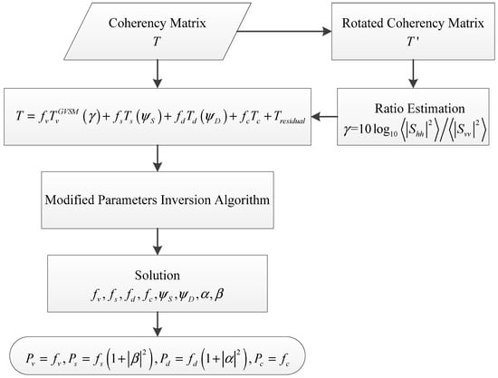 The ratio is directly estimated according to the measured coherency matrix. As this parameter describes the elements of the volume matrix components, we first apply Lee’s polarimetric orientation compensation [30] in order to lower the coupling to the volume component of other scattering sources not originated within the canopy. For every pixel, as is computed, the corresponding volume model will be determined according to Equation (4), hence no new unknowns are added to the inversion step. Afterwards, the nine-unknown equation system will be solved by using a nonlinear least-square optimization based on the modified parameters inversion algorithm as proposed in [23,24]. The flowchart of this method is shown in Figure 4.