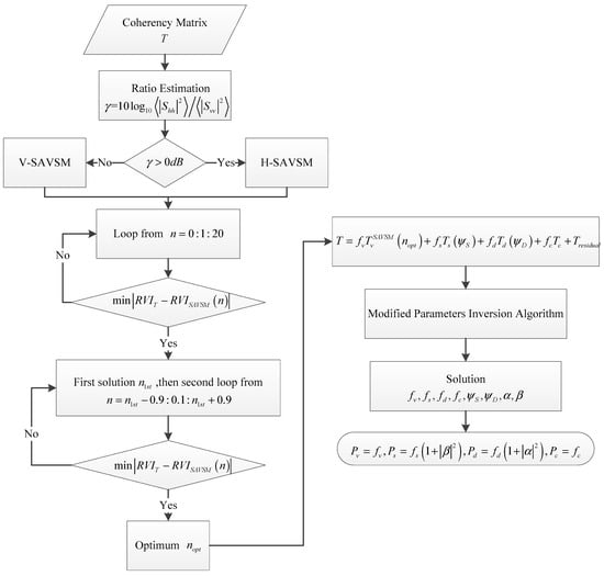 Flowchart of general model-based decomposition with simplified adaptive volume scattering model (SAVSM).