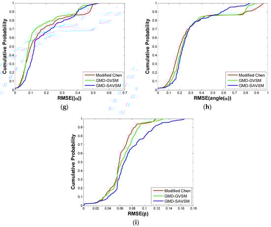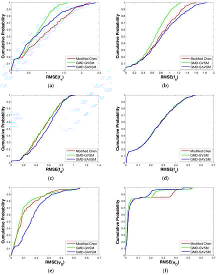 For every case, we tested three general model-based decomposition (GMD) methods: (1) “Modified Chen”: This is assumed as the reference method, i.e., the original model proposed in [22] with the modified parameter inversion algorithm in [23,24]; (2) “GMD–GVSM”: The first proposed method, i.e., incorporating the GVSM in [25] also with the modified parameter inversion algorithm in [23,24]; (3) “GMD–SAVSM”: The second proposed method, i.e., incorporating the SAVSM in [26,27] also with the modified parameter inversion algorithm in [23,24]. In order to quantitatively assess the respective performances, we firstly calculated the root mean square error (RMSE) for every model parameter according to 1000 realizations. Then, as shown in Figure 6, we computed the corresponding cumulative probability distribution curves of RMSE of all parameters for all the 216 different cases. Note that the cumulative distribution function is defined as