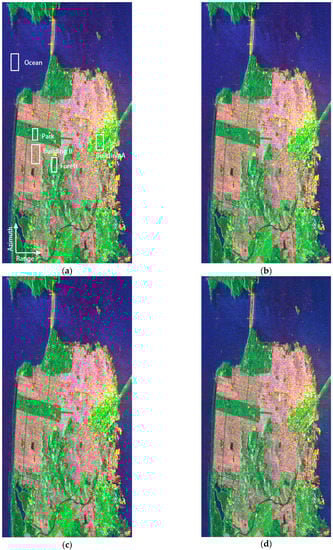Decomposition results from Radarsat-2 data over San Francisco area. (a) Yamaguchi decomposition with orientation compensation; (b) Modified Chen decomposition by using modified parameter inversion algorithm; (c) Proposed GMD–GVSM decomposition; (d) Proposed GMD–SAVSM decomposition. The images are colored by Pd (red), Pv (green), Ps (blue).
