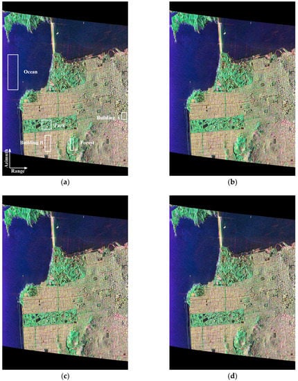 Figure 8 shows the decomposition results from these four methods. According to a visual inspection, no evident differences can be seen in all four results. In forest and park areas, the volume scattering power is relatively dominant in most pixels (green color). The ocean areas present dominant surface scattering, hence the color is blue. For the build-up areas, the volume scattering component is still overestimated specially in those largely oriented build-up areas in patch A.