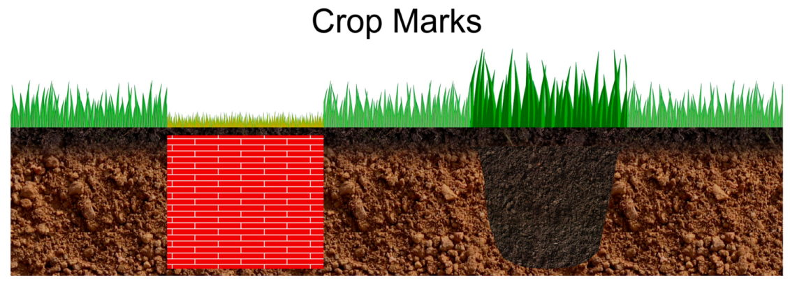 - Evans, R.; Jones, R. Crop marks and soils at two archaeological sites in britain. J. Archaeol. Sci. 1977, 4, 63–76. [Google Scholar] [CrossRef]