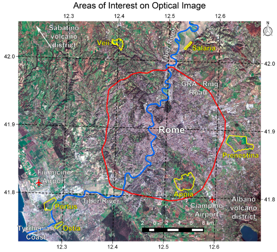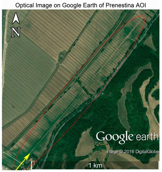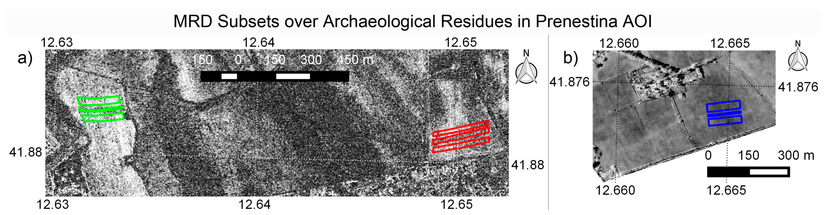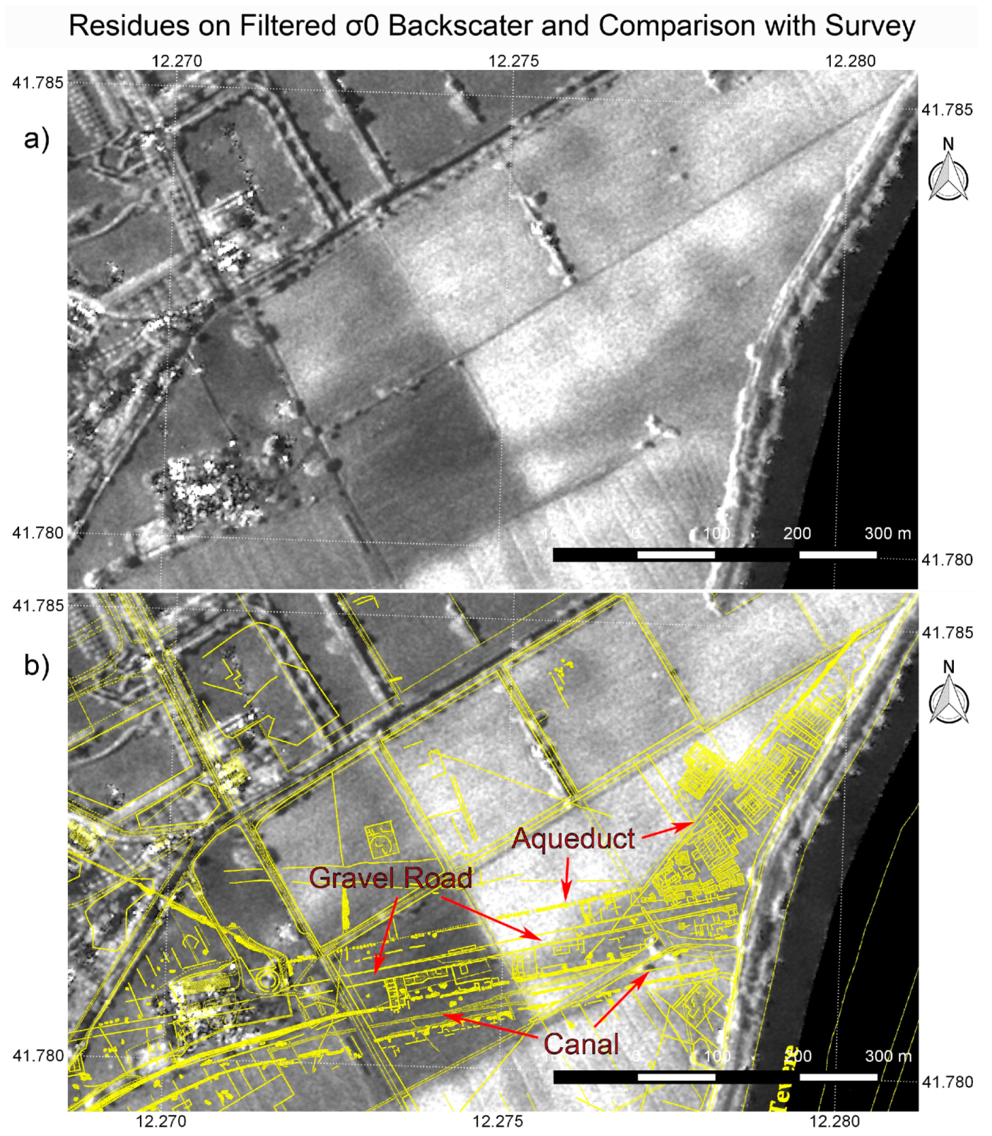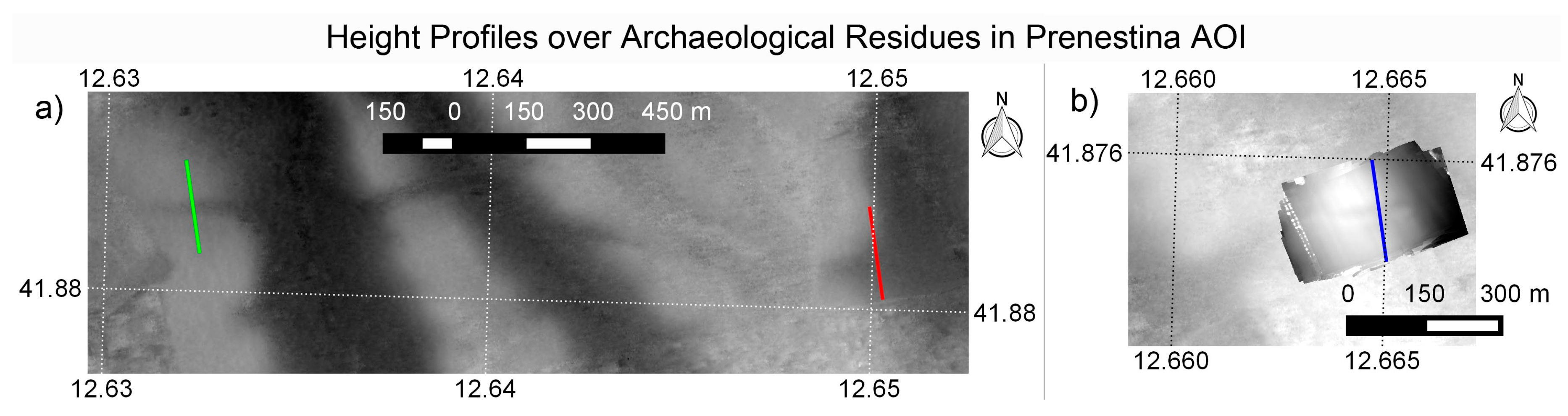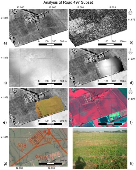 - Stewart, C.; Di Iorio, A.; Schiavon, G. Analysis of the utility of COSMO SkyMed stripmap to detect buried archaeological features in the region of Rome. In Proceedings of the 4th EARSeL Workshop on Cultural and Natural Heritage, Matera, Italy, 6–7 June 2013; Lasaponara, R., Masini, N., Biscione, M., Hernandez, M., Eds.; European Association of Remote Sensing Laboratories (EARSeL): Matera, Italy, 2013; pp. 203–212. [Google Scholar]