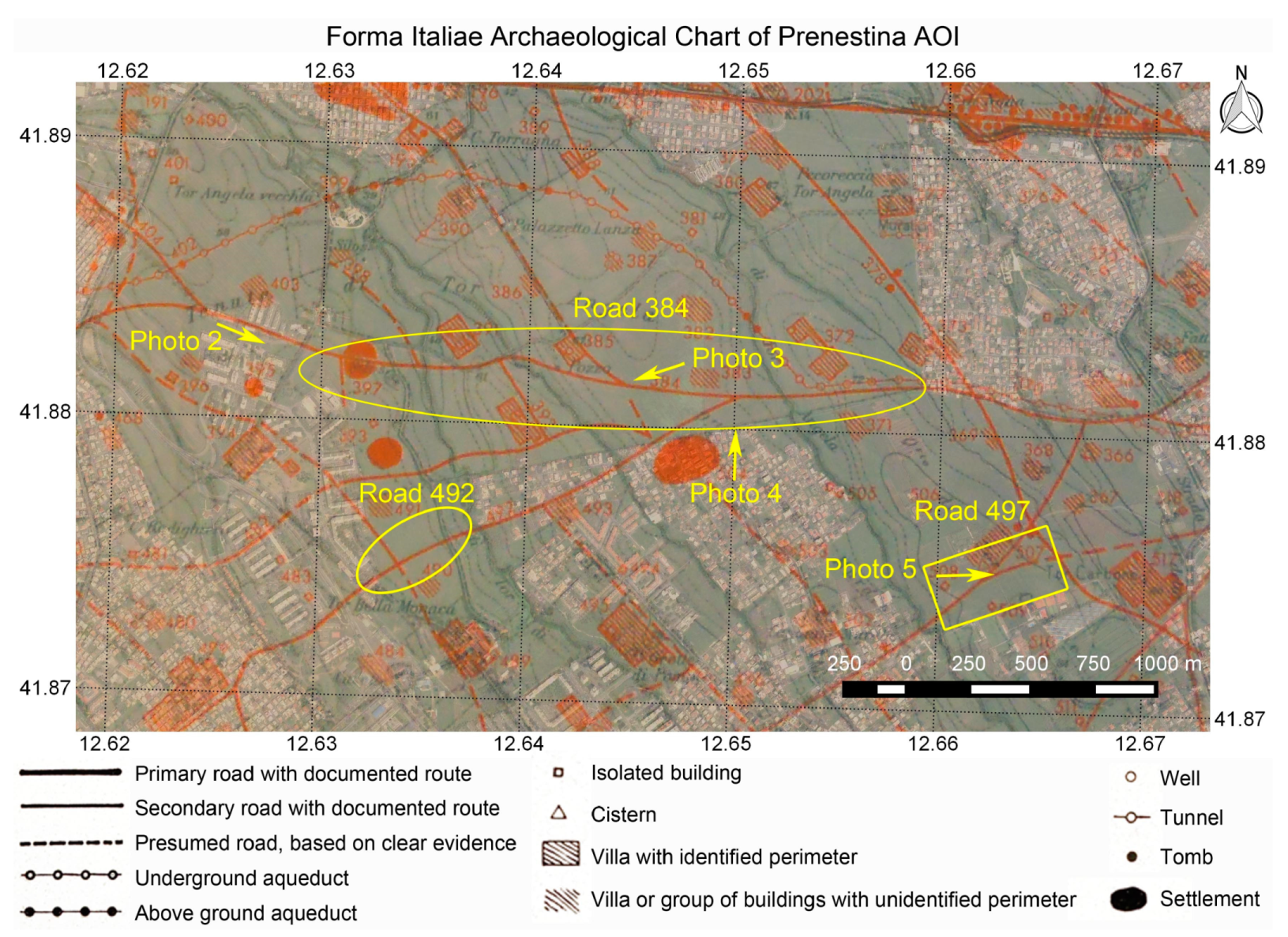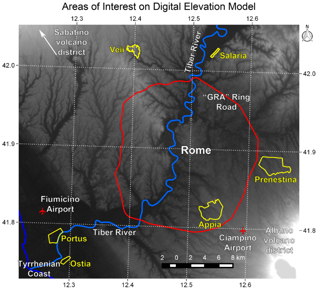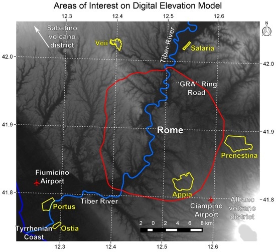 - Rosa, P. Carta Topografica del Lazio; Archaeological Chart of Lazio, at a Scale of 1:20,000; Soprintendenza di Roma: Rome, Italy, 1870. [Google Scholar]