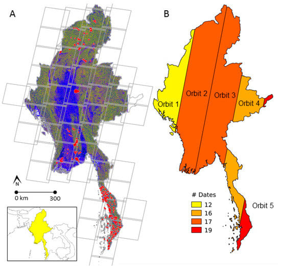 Data were obtained as Standard Archive Format for Europe (SAFE), which contains general product information in XML, for the entire region using the open access data archives. Annotated data sets hold metadata on the main characteristics including acquisition, image properties, polarization, Doppler information, swath merging, calibration, and geographic location. SAFE products were obtained as Ground Range Detected (GRD), which have already been focused, multilooked, calibrated and projected in ground range. We performed comparisons and sensitivity testing between GRD and Single Look Complex (SLC) that included combinations of multilooking and speckle filtering using image differencing and examination of algorithms at training sites. Given that ESA began observations using GRD, no improvements were found in products at training sites using SLC in correspondence with the approach executed in this effort, and the tradeoff in processing requirements, we focused on GRD for a larger (time and space) archive of images. Data were terrain-corrected, normalized, and calibrated using local incidence angles and cosine correction before converting to sigma naught (σ° dB) for mapping and analyses. A nominal 20 m spatial resolution was executed in this effort for final products considering size, speed, connectivity, and formats when sharing data with local and international partners. Layover and shadow map were generated for post processing using a Shuttle Radar Topography Mission version 4 Digital Elevation Model. A total of 39 Sentinel-1A images were required for a single time period, wall-to-wall mosaic of Myanmar. Sentinel-1 data were divided into five unique orbits and mosaicked by cycles. For time series analysis, a total of 632 images were used, across all orbits and cycles (dates) (Figure 1).