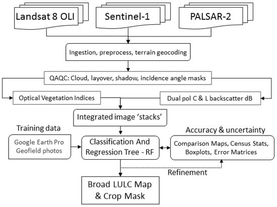 A Classification and Regression Tree (CART) routine was applied to generate the updated Land Use Land Cover (LULC) map using a stacked data cube (Figure 3). The data cube was created from stacking the preprocessed Landsat-8, PALSAR-2, and Sentinel-1 observations following the lineage of []. The ensemble, machine-learning, random forest algorithm [] was used as the initial classifier with the training data. A random forest is generated through the creation of a series of CARTs using bootstrapping, or resampling with replacement. Random forest is a flexible and powerful nonparametric technique that many mapping applications have recently implemented for a range of studies including mapping crops [,,], wetlands [,], canopy height [], algal blooms [], urban sprawl [], biomass [], plantations [], and many other thematic areas.