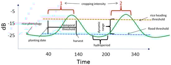 Conceptual Sentinel-1 double rice signature with key indicators highlighted from management (i.e., inundation) and rice growth stages (i.e., biomass development and dynamic range).