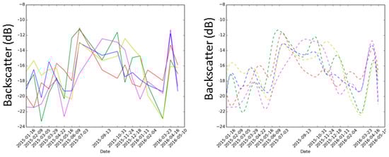 TSA was carried out using all available Sentinel-1 IW Mode data between 14 February 2015 and 7 May 2016. To map crop calendar, we followed the linage of Rojas et al [] that have successfully used optical indices (i.e., NDVI) and phenological patterns to note seasonality. Due to the noise, inherent in SAR data, and temporal gaps in this dataset, various interpolation and smoothing techniques, such as Savitsky–Golay [], Whittaker [], cubic splines, and linear, were evaluated to create a more complete temporal backscatter signature (Figure 5). Many studies have described the strengths and limitations of these different smoothing techniques (e.g., [,,]). For calendar mapping, peak VH backscatter was identified using maximum value. The previous minimum (valley) before upward inflection that is caused from biomass development was identified as an emergent or transplant date. Other peaks in the time series that are at least 20% of the absolute maximum were searched as a metric of cropping intensity (i.e., single, double, triple). A set of temporal thresholds were tested and integrated to ensure unrealistic outcomes, which were flagged and excluded. In this research calendar, dates were constrained to eliminate any crop cycles shorter than 80 days, and cropping intensities larger than two during the main crop periods. These parameters were selected based on a conservative deduction from local field surveys, limited census statistics, and expert knowledge.