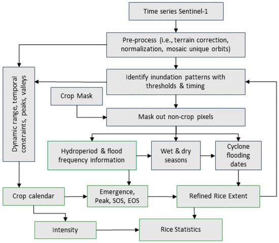 Work flow for refining rice information products (extent, hydroperiod, calendar, intensity, harvested area) using dense time series Sentinel-1, masks, and phenological analysis.