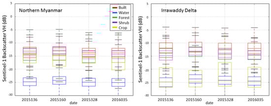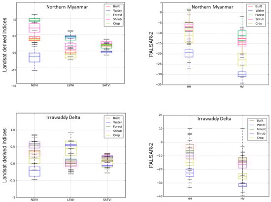 Up-to-date land use land cover data are not widely available for Myanmar and this effort represents one of the few datasets available at moderate resolution covering the entire region. The example box and whisker plots highlight the strength of a given sensor for a specific class and/or season. Figure 7 illustrates Sentinel VH differences between northern Myanmar and Irrawaddy Delta with distinctions in crop inundation. Northern Myanmar tends to be dry with more scattered rainfed rice relative to the delta as evident by the response in backscatter being 8–10 dB lower on similar dates. In northern Myanmar, crops were more likely to be confused with forest and shrub in the initial classifications as compared to the delta where crop and water are more likely to get confused if only using single time imagery during the main wet season. Landsat NDVI separated classes well in northern Myanmar, excluding built and crop due to the use of Landsat from the dry season (no clouds) when crops are not grown and fields are often fallow. In the delta, crop and water are more likely to get confused when only using single time imagery due to abundance of rice crops in this region and the flooding of paddies typical of this crop type. PALSAR-2 strengths were in identifying inundated area given its long wavelength and penetration capabilities. However, only having one time period from PALSAR-2 limits its applicability for monitoring phenology.