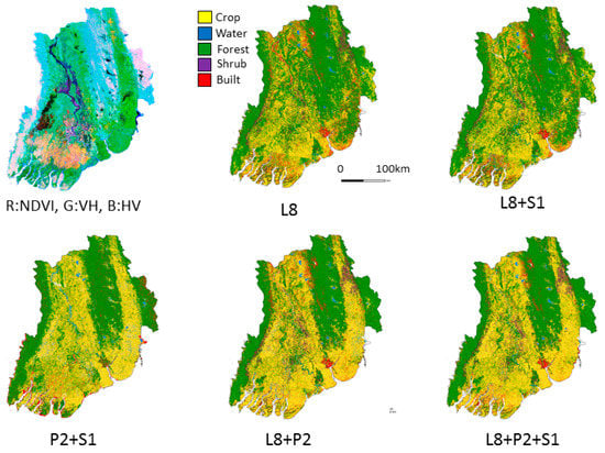 False color (R: Landsat NDVI, G: Sentinel-1 VH, B: PALSAR-2 HV) and classification outcomes for Irrawaddy Delta using different combinations of Landsat-8 OLI (L8), Sentinel-1, and PALSAR-2.