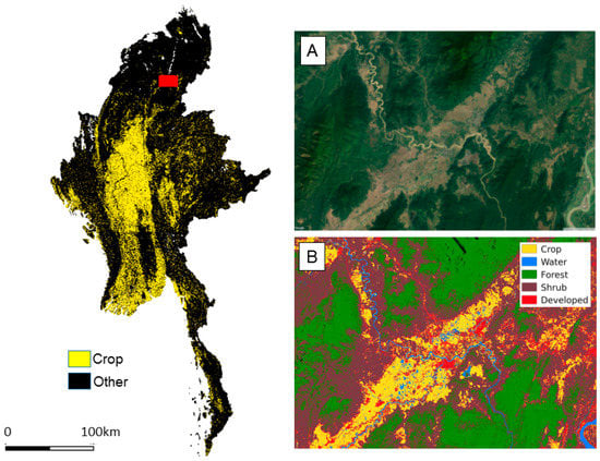 Updated (2015) crop mask for Myanmar using integrated optical and SAR inputs and example zoomed in snapshot (A: Google Earth, B: Classification) of Mogaung region within Kachin State.